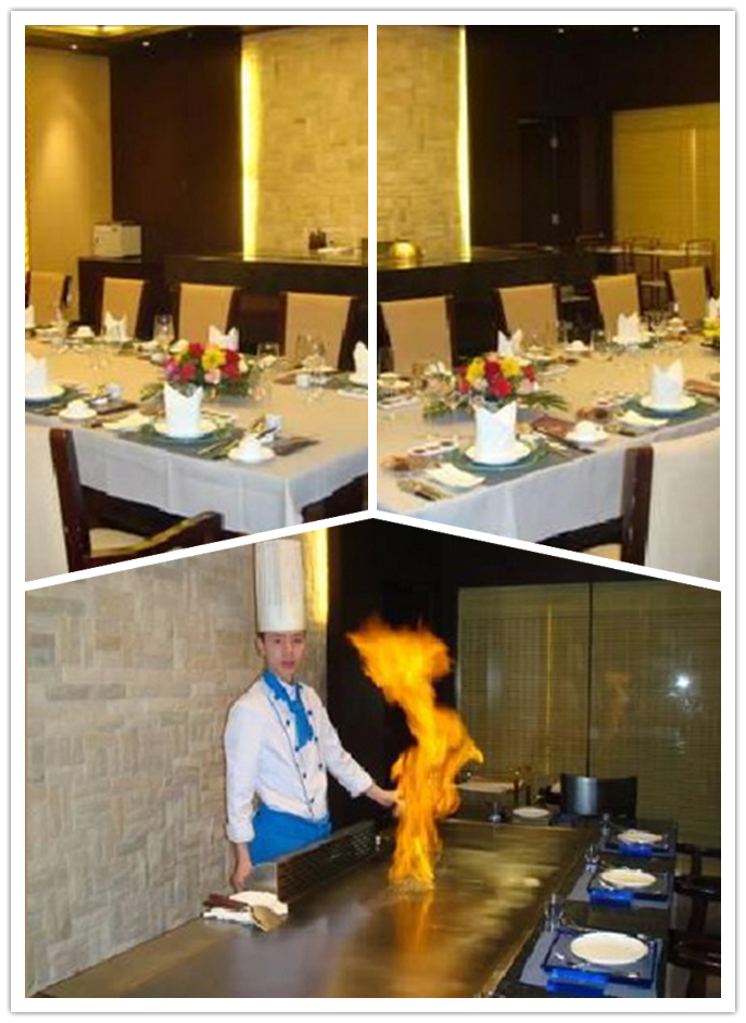法式鐵板燒餐廳,位于會(huì)務(wù)樓一層,聘請(qǐng)專業(yè)主廚,將法式鐵板燒與長(zhǎng)白山飲食文化有機(jī)結(jié)合,打造出具有濃厚地方特色的法式山珍鐵板燒。