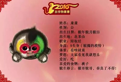 猴年春晚吉祥物"康康",由北京奧運會吉祥物"福娃"的創(chuàng)作者韓美林大師設計,以中國傳統(tǒng)水墨畫的藝術(shù)形式,表現(xiàn)"猴"的特點。這也是春晚歷史上第二任吉祥物。