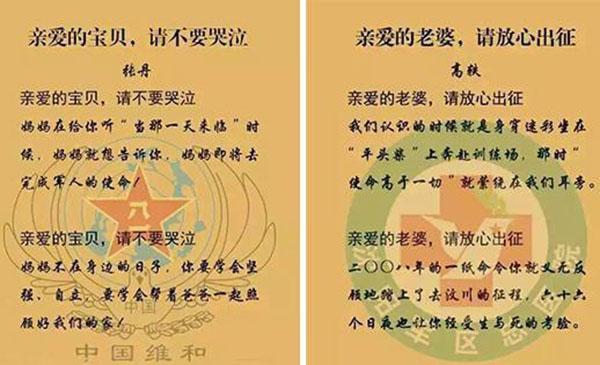 媽媽在給你聽‘當(dāng)那一天來臨’時候,媽媽就想告訴你,媽媽即將完成軍人的使命。"……