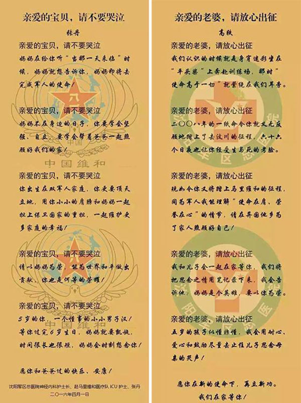 這是既作為母親又是一名軍人醫(yī)生的張丹在第四批赴馬里維和部隊正式組建完成之際,向自己的愛人和5歲的孩子的深情告別。