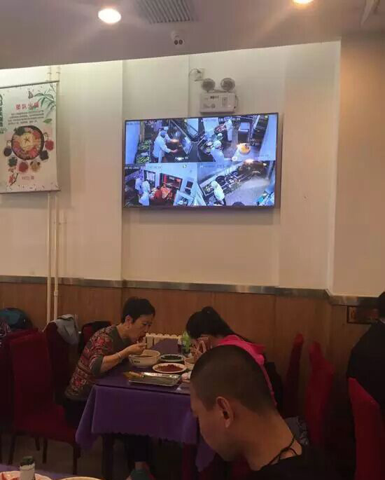 華天延吉餐廳每層用餐區(qū)都掛有55寸顯示器直播后廚狀況。