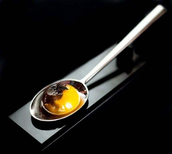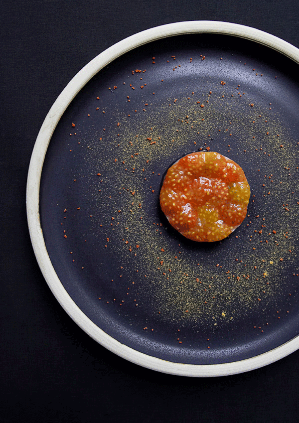 ↑↑↑大西洋小龍蝦卵點(diǎn)綴番茄,又是一個(gè)同心圓的擺盤方式,與黑色的盤子特別配。