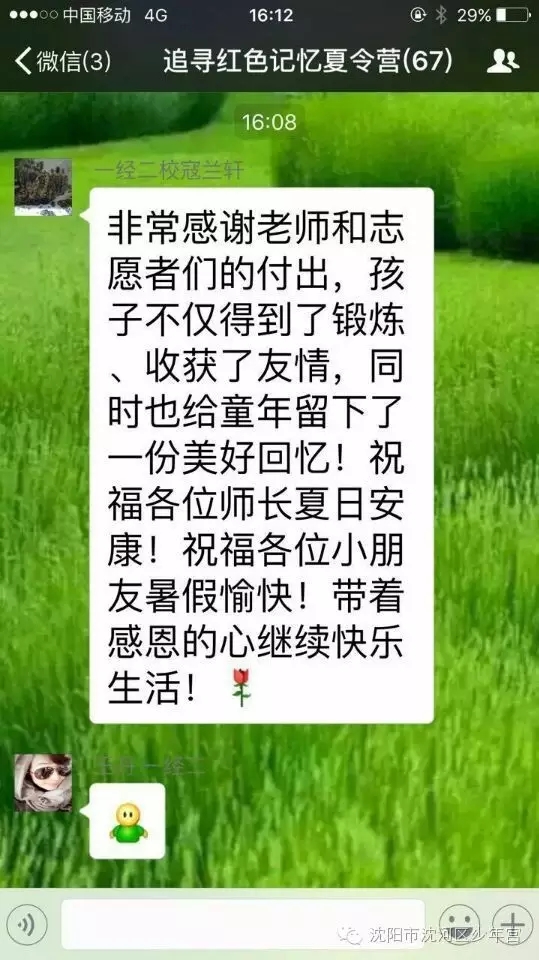 兩天的活動在少年宮老師細(xì)心周到地安排下,孩子們過得既充實(shí)又開心。滿洲省委舊址里認(rèn)真地聆聽講解、樹蔭下聽老英雄追憶往事,沈陽市團(tuán)校內(nèi)揮汗如雨的歷奇訓(xùn)練、夜晚多功能廳內(nèi)興高采烈地聯(lián)歡、荷花池旁的駐足、科技館里探索科學(xué)世界的秘密……這一幕幕都深深地刻在了孩子們的腦海里,洪亮的口號是孩子們堅(jiān)定的信念,張張笑臉是活動過程中成功的印記。白天孩子們共同享受團(tuán)隊(duì)生活的快樂,夜晚躺在床鋪上一起述說童年的趣事。閉營儀式上,同學(xué)們相擁而泣,短暫的兩天讓大家結(jié)下了深厚的友誼。