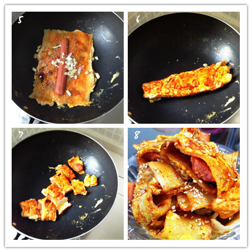5、涂上預先調(diào)好的醬,將小火煎熱的火腿腸放入,加少量醋、孜然、鹽、香菜末、蔥末;6、將烤冷面從兩側向中間裹住香腸;7、用木鏟切成小段;8、出鍋,大功告成。