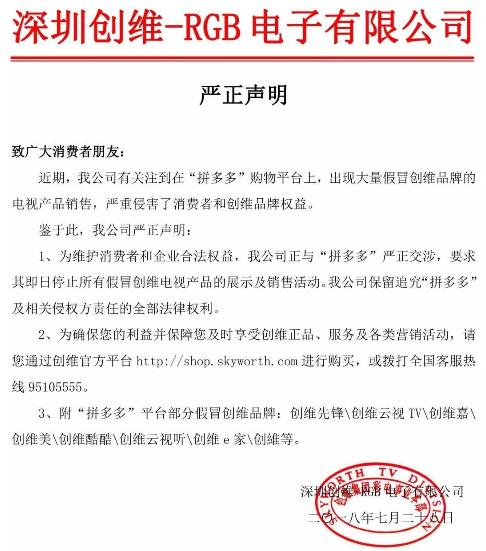 創(chuàng)維7月28日發(fā)布聲明稱(chēng),針對(duì)拼多多平臺(tái)上出現(xiàn)的涉嫌假冒創(chuàng)維品牌的電視產(chǎn)品,正與拼多多嚴(yán)正交涉,要求即日起停止所有假冒創(chuàng)維電視產(chǎn)品的展示及銷(xiāo)售活動(dòng),并保留追究拼多多及相關(guān)侵權(quán)方的全部法律責(zé)任。