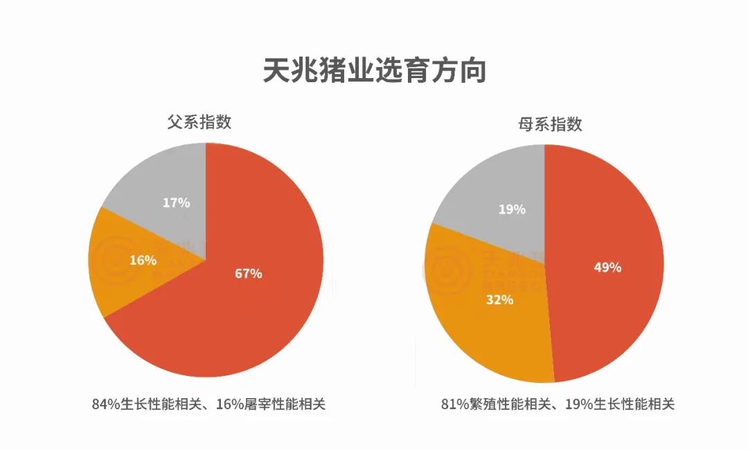 天兆豬業(yè)經(jīng)過充分的市場調研,針對中國市場的需要,結合實際生產條件,以引進的加系、法系種豬為基礎進行持續(xù)選育,并在選育方向上強化了繁殖性能、生長性能、屠宰性能等性狀所占的權重,通過十多年的持續(xù)選擇,不斷提升種豬綜合性能水平。