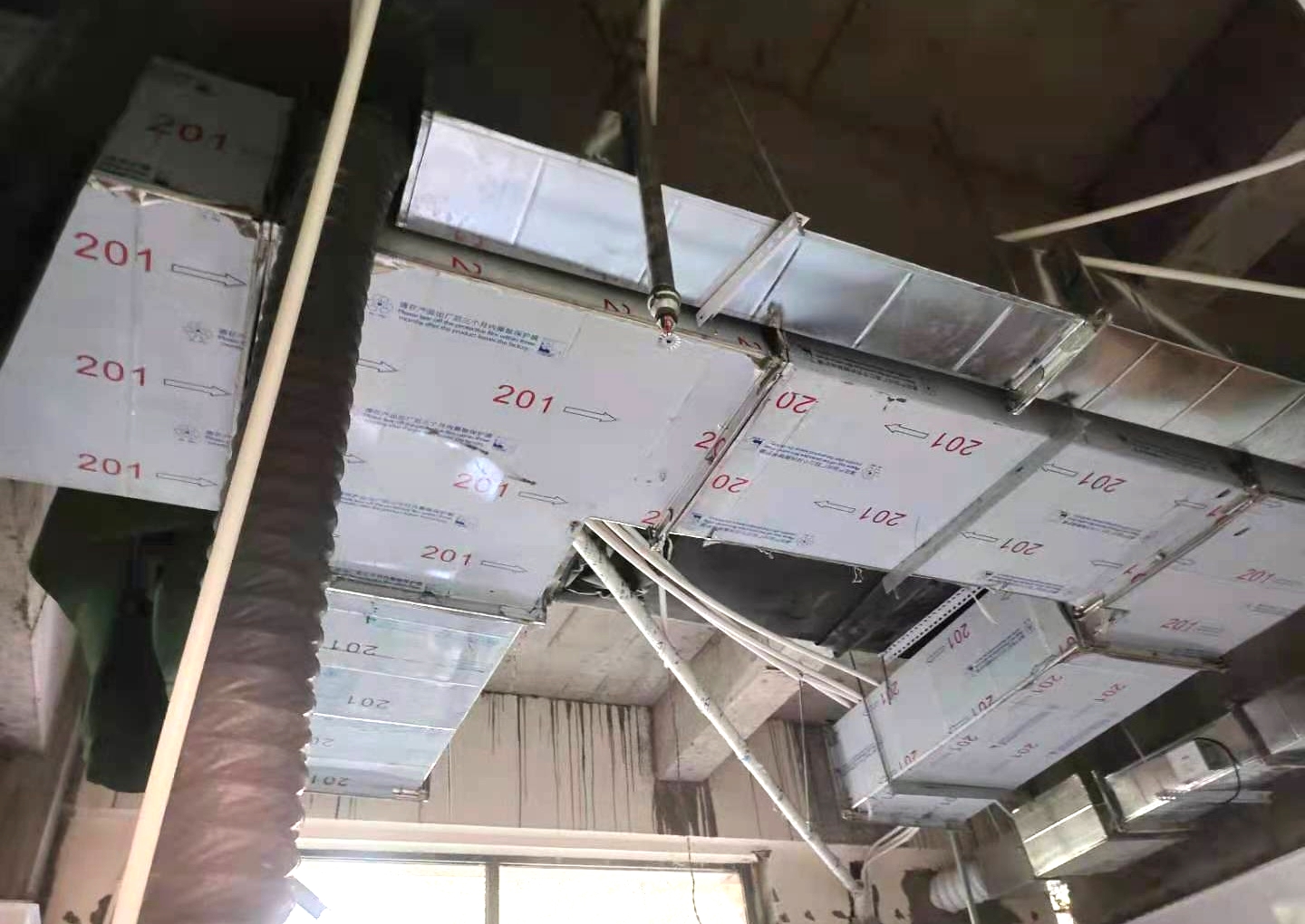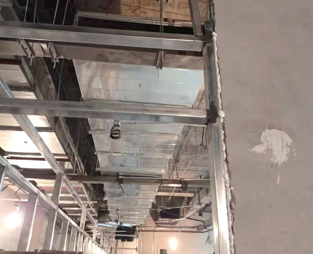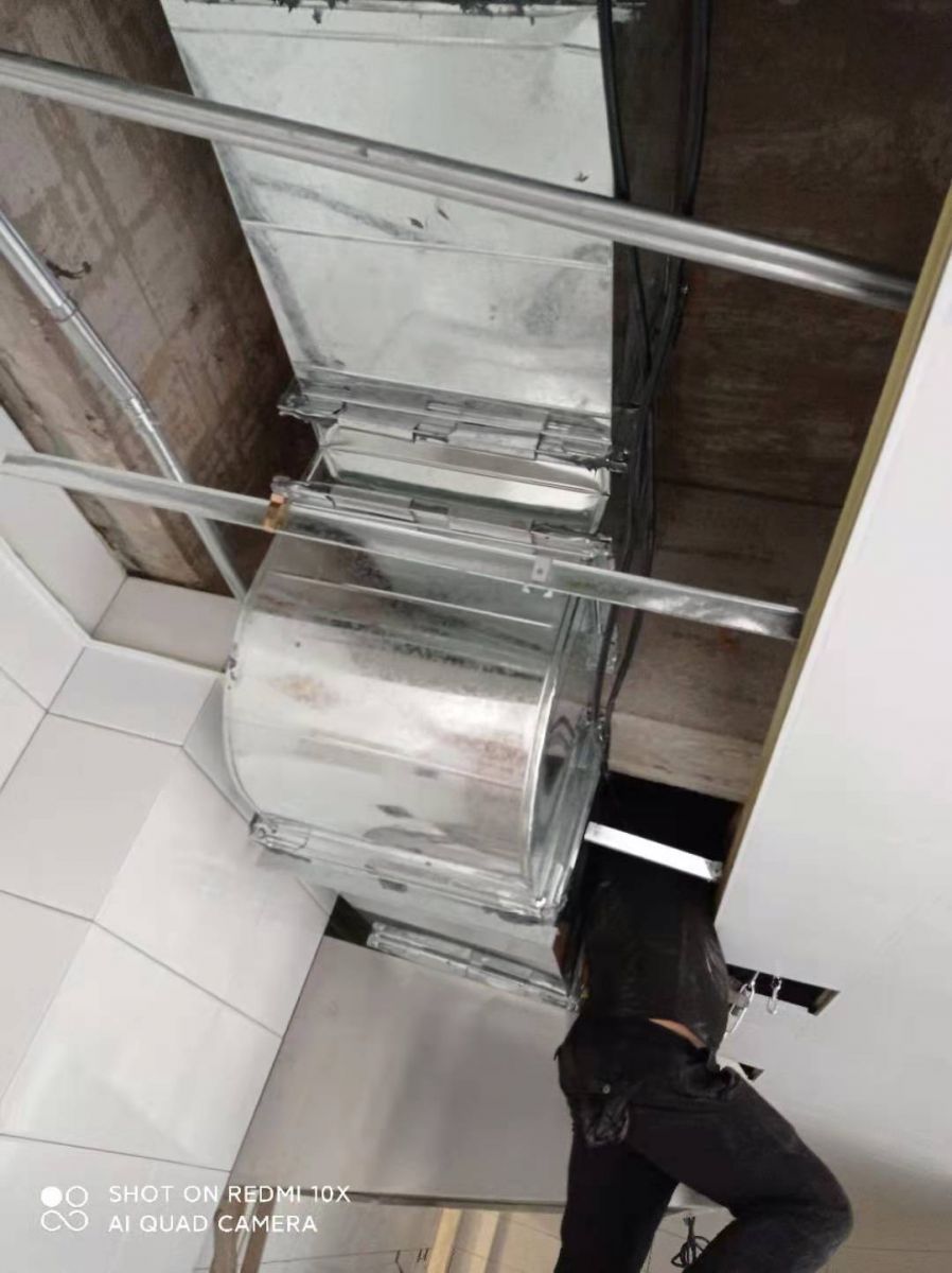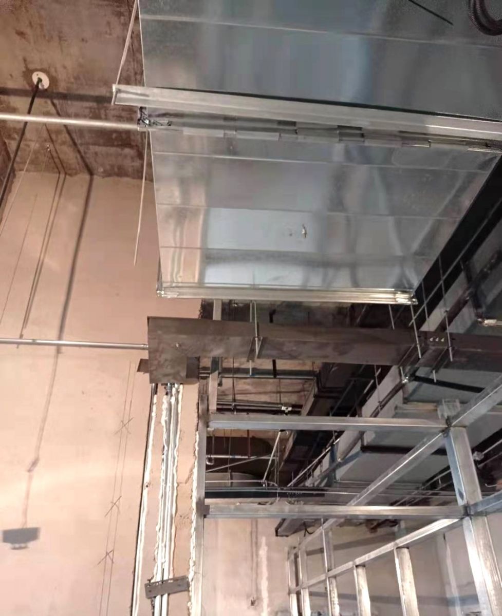 副食間、主食間煙罩風(fēng)管對(duì)接完成,五樓明檔煙罩吊完