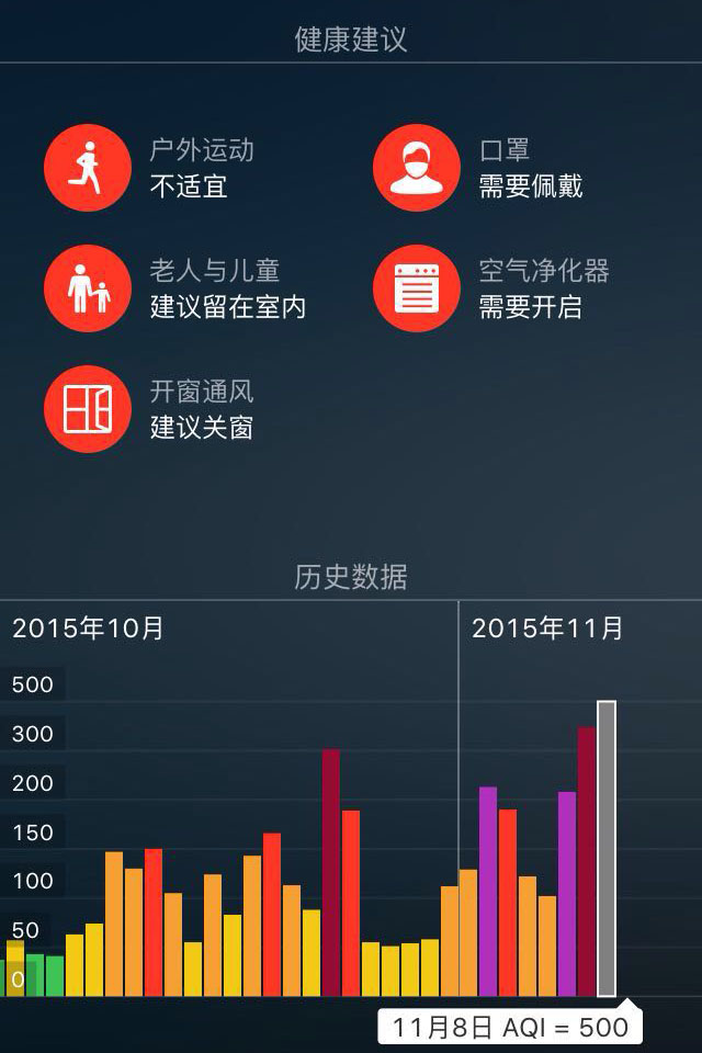 今日(周一)的空氣質(zhì)量相對周日有所好轉(zhuǎn),但依然是處于嚴(yán)重污染的狀態(tài),近期外出,口罩成了必備品,老人和兒童留在室內(nèi)是"安全"的選擇。建議室內(nèi)養(yǎng)殖一些綠色植物,在不宜開窗換氣的天氣中,綠色植物可以改善室內(nèi)空氣質(zhì)量。