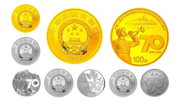 為紀(jì)念中國人民抗日戰(zhàn)爭暨世界反法西斯戰(zhàn)爭勝利70周年,中國人民銀行自2015年8月20日起陸續(xù)發(fā)行紀(jì)念幣一套,包括金銀紀(jì)念幣3枚、鎳包鋼紀(jì)念幣1枚,均為法定貨幣。金銀紀(jì)念幣由深圳國寶造幣有限公司、沈陽造幣有限公司和上海造幣有限公司三家鑄造。